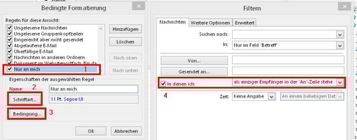 Geben Sie Ihrer neuen Bedingten Formatierung einen Namen (z. Bsp. "Nur an mich") (1). Wählen Sie über Schriftart (2) wie die Mails, die nur an Sie gerichtet sind formatiert werden sollen. Jetzt klicken Sie auf Bedingung (3) und stellen diese wie in (4) gezeigt ein.