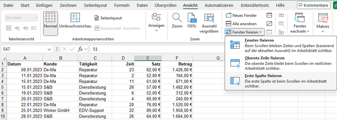 Man kann sowohl Zeilen einfrieren (meist die erste Zeile mit den Überschriften) als auch Spalten einfrieren (z. B. Kundennamen in der ersten Spalte). In umfangreichen Tabellen lässt sich auch eine Kombination aus beidem anwenden.